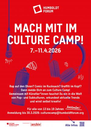 Vom 7.–11. April hast du die Chance, fünf Tage lang in die Welt von Pop- und Subkulturen einzutauchen! Du erkundest aktuelle Trends, entdeckst die Hotspots von Streetart in Kreuzberg und chillst mit anderen um die Wette. Ein Team von Künstler*innen und Kulturschaffenden begleitet die Workshopwoche und gestaltet die kreativen Sessions. Du lernst das Archiv der Jugendkulturen kennen und probierst Dich in den Bereichen Comic & Manga, Rap sowie Urban- & Streetart praktisch aus. Vielleicht hast du auch Lust, Teil eines Video- und Fotodokumentationsteams zu sein. Die Ergebnisse und Inputs aus dem Camp fließen in eine große Ausstellung über Popkultur und kulturelle Aneignung ein, die das Humboldt Forum im Jahr 2027 eröffnen wird.